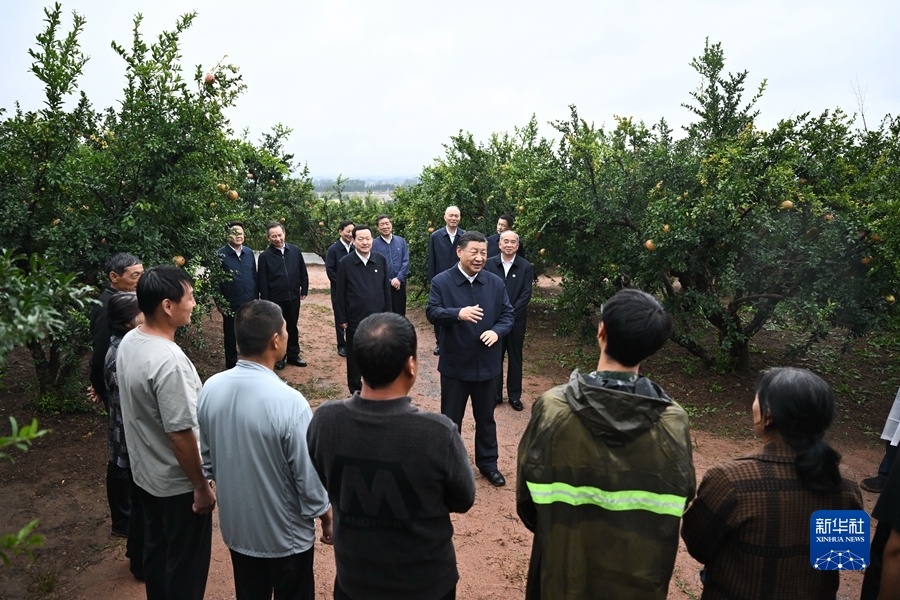9月24日,中共中央总书记、国家主席、中央军委主席习近平在浙江考察结束返京途中,来到山东省枣庄市考察。这是习近平在位于峄城区的冠世榴园石榴种植园了解石榴产业发展情况。