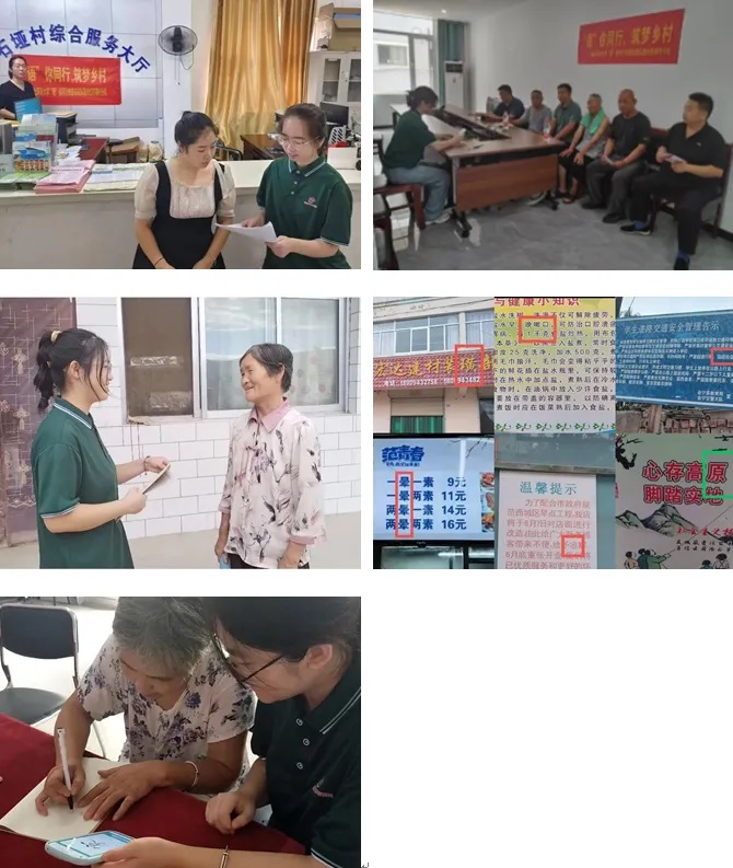 推普实践队分别深入甘肃白银湾口村、湖北随州红石垭村、浙江温海安村、山东德州钟寨村、浙江嘉兴孙桥村五个农村地区及其周边地域,开展推普调研和宣传活动。实践队员来到村民家中,进行国家语言文字法律法规和政策宣传,运用《普通话培训测试指要》《中华经典诵读读本》与村民进行沟通与互动,了解本土风俗文化,积极开展普通话测试、汉字书写、经典领读等推普内容;推普队员走进乡镇街道,对店铺的广告牌、宣传栏、通知公告中的汉字进行错别字查找和校正;推普队员还对周边村民进行问卷调查和走访谈话,鼓励村民用“普通话小镇小程序”、人工智能错别字笔顺纠正等APP和小程序。