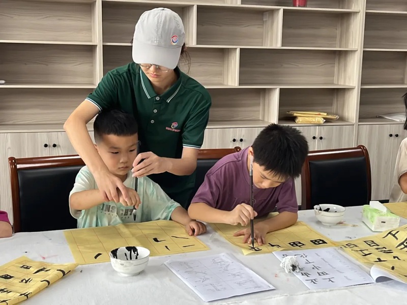 推普队员在黄石市杭州东路社区教学生写毛笔字