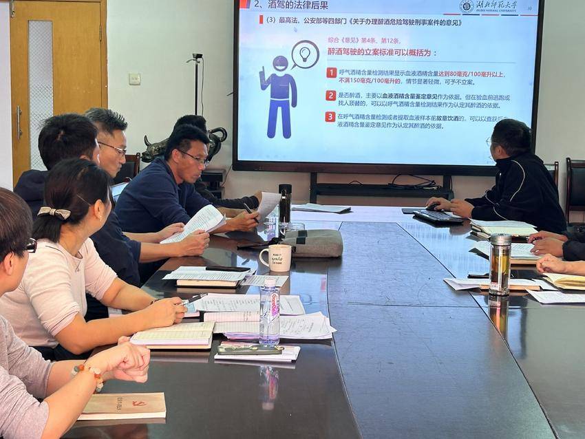 刘锐以《生命不能承受之‘醉’》为题的视频集作为导入,从什么是“酒驾、醉驾”、酒驾的风险及后果、远离酒驾平安回家三个方面,详细讲解了法律上酒驾、醉驾的标准,以及涉及酒驾醉驾的《道路交通安全法》《刑法》《关于办理醉酒危险驾驶刑事案件的意见》等相关规定,介绍了酒后驾驶的风险、成本、共同饮酒人可能承担的责任、酒驾的四大误区、防范醉驾风险的措施等内容,并通过酒驾醉驾典型案例,用身边事教育身边人,告诫老师们必须牢记法律规定、消除侥幸心理、严格自我约束,杜绝酒驾醉驾。