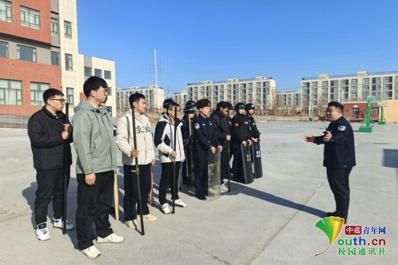 图为实习队员参加学校组织的反恐防暴应急演练,当地民警演示防暴器具的使用。