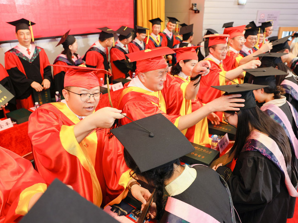 在庄重热烈的学位授予环节中,校领导和学位评定委员会委员一一为毕业生正冠拨穗,颁发学位证书。毕业生们笑容满面,享受属于自己的毕业礼成时刻。随后,现场响起《再见,同路人》的歌声,大屏幕上播放着属于这一届毕业生从入校到毕业的珍贵画面,再现了他们共同学习生活实践的青葱岁月。