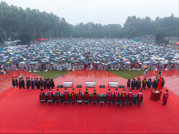 毕业典礼当天下起了大雨,老师和同学们穿着学校发的雨衣,依然风雨无阻举行典礼。校友的分享很励志、校长的讲话很鼓舞人心,88位导师走进毕业生人群中,逐一拨穗。