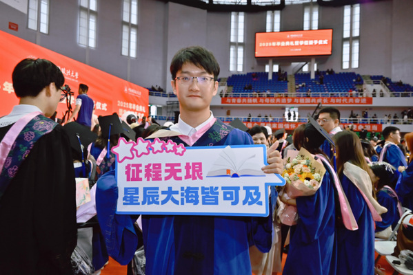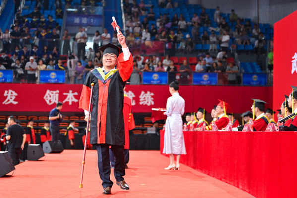 武汉理工大学2025年毕业典礼暨学位授予仪式上,一名毕业生拄着拐杖登台,兴奋之情溢于言表。这一高光时刻,是拼搏的勋章,更是奔赴新途的序章。