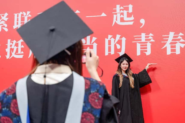 6月22日,华中农业大学在狮子山广场举行2025年毕业典礼暨学位授予仪式,为毕业生青春加冕、御风启程。学校在通往典礼的路上铺设红地毯,两旁悬挂着毕业生大学期间的照片,毕业生可以在这里合影留念。图为一名硕士毕业生在照片墙前留影。