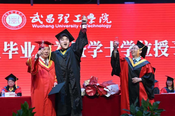 6月21日,华中农业大学2025年“异曲同工”毕业巡游活动如约而至。同学们踏着欢快的音乐沿着樱花路行进,一路载歌载舞,不时驻足与道路两旁的师生家长互动。青春洋溢的舞蹈引得围观者纷纷拿出手机记录这美好的瞬间。图为工学院队伍中“工小蓝”和“工小粉”两位人形机器在机车前领航。