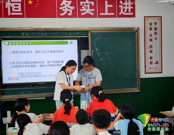 支教老师宗庭竹和学生一起演示卫生巾的正确使用方法 程晓丹 供图