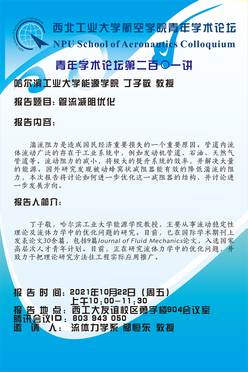 【学术报告】航空学院青年学术论坛201讲——哈尔滨工业大学能源学院 丁子敬 教授