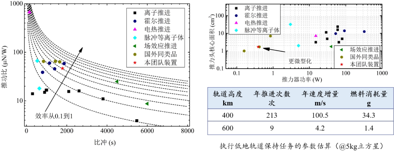 基于上述离子液体电致发射过程的机理认识,突破结构设计、材料制备、器件加工等多项关键技术(公开发明专利3项,授权软件著作权1项),打破常规离子液体选用方案,研制出具有启动电压千伏以内的离子液体电推力器样机,远低于液态金属场发射推力器数千伏至上万伏的工作电压,显著降低电源系统难度,具备千伏级电压条件下高效率性能输出能力(比冲千秒量级以上),电能消耗低至1W以内,能够满足空间任务需求,为微纳卫星提供高性能备选推进方案。