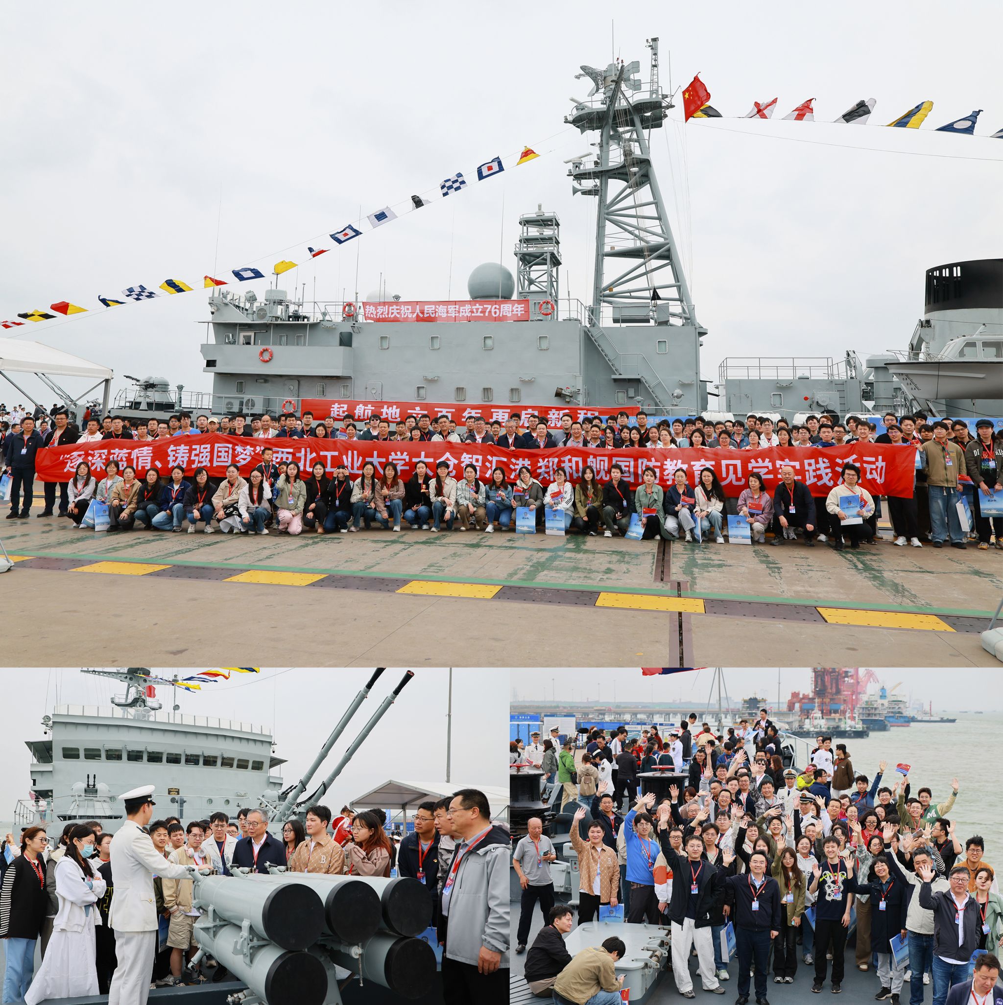 为强化“总师型”人才培养,造就国防军工拔尖创新型人才,在庆祝人民海军成立76周年之际,BEAT365英国官网太仓智汇港与海军郑和舰开展了“逐深蓝情、铸强国梦”国防教育实践活动。通过登舰参观、座谈交流、联谊互动等环节,师生们近距离感受人民海军现代化建设的辉煌成就,与国防一线官兵共话科技强军使命,在深蓝海疆的壮阔图景中厚植家国情怀。