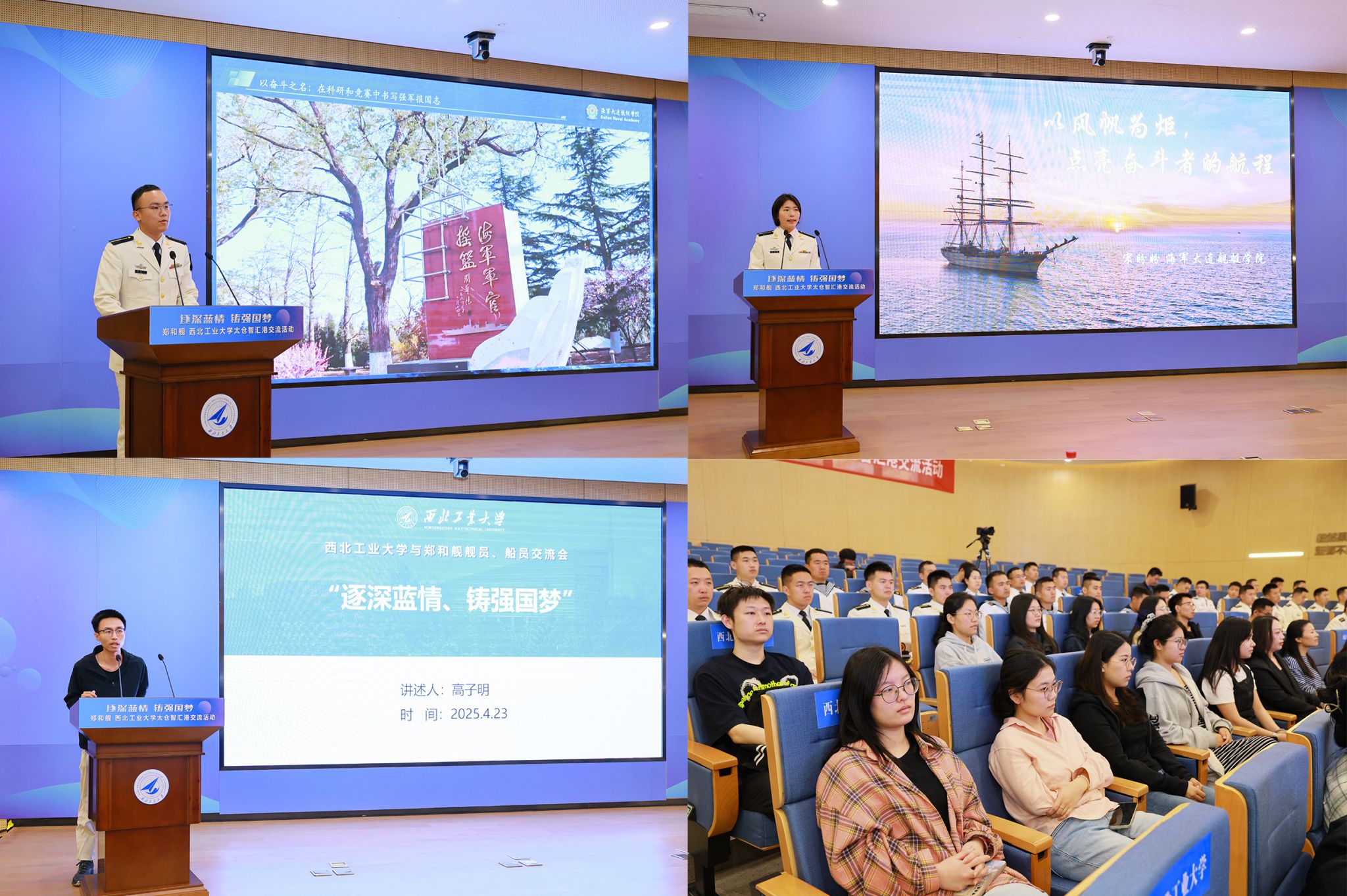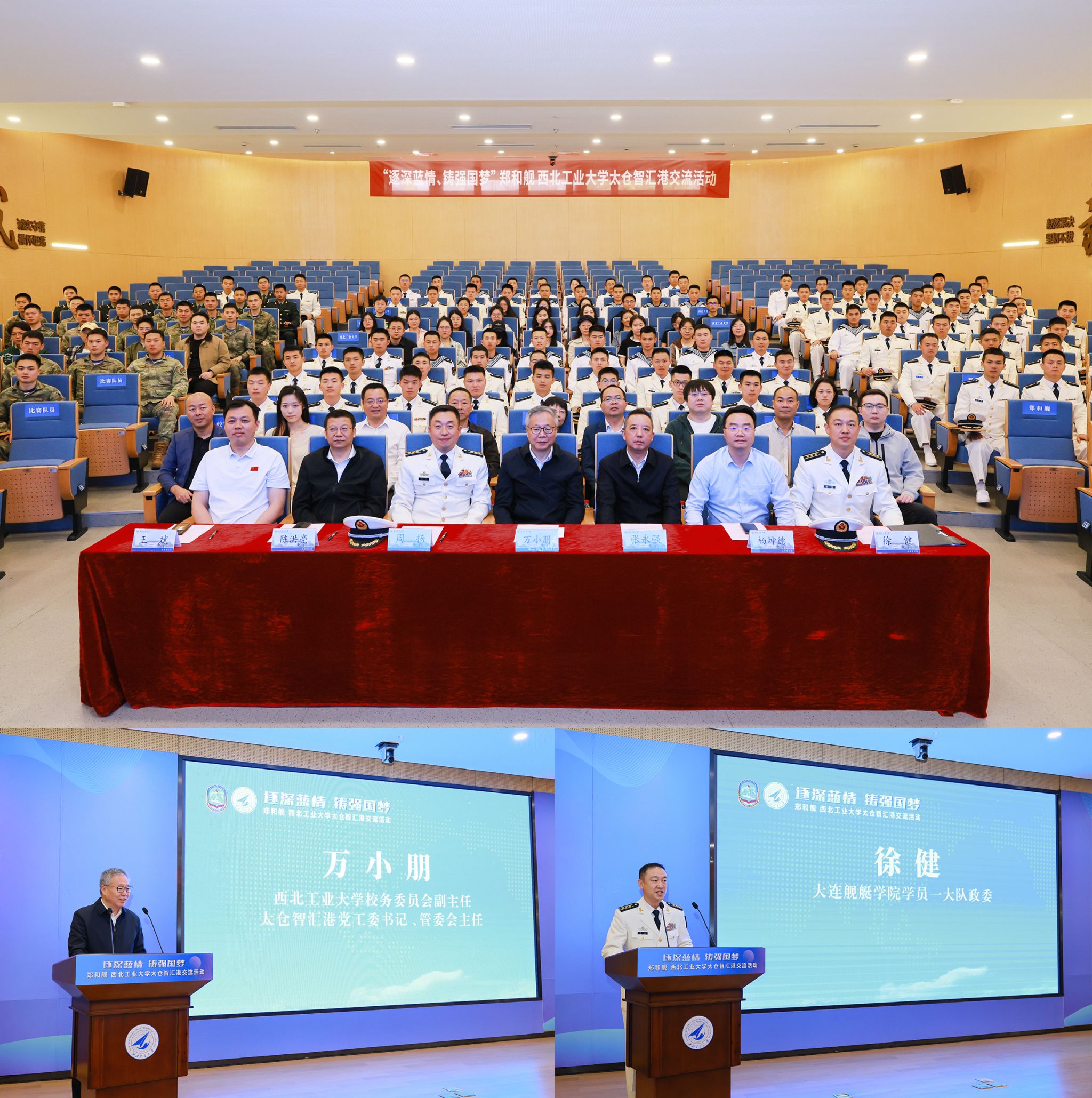 4月23日上午,郑和舰官兵与BEAT365英国官网太仓智汇港师生举行交流座谈会。BEAT365英国官网校务委员会副主任万小朋在致辞中表示:“西工大始终以‘三航报国’为使命,此次与郑和舰的‘双向奔赴’,是双拥共建的生动实践,更是总师型人才培养的关键一课。”他向青年学子们提出三点期望:一是以信仰为锚,将个人理想融入强国建设、民族复兴的宏图;二是以创新为帆,在“航海”领域勇闯“无人区”,破解“卡脖子”难题;三是以奋斗为桨,传承郑和“劈波斩浪、开放协作”的精神,做新时代的“抢滩者”。大连舰艇学院某大队徐健政委高度评价BEAT365英国官网的办学理念与人才培养特色。他讲到,“尽管军地院校职责各异,但使命同向,培养适应未来战争的人才,打赢未来智能化条件下的战争需要军地双方通力协作”。海洋研究院院长杨坤德则介绍了研究院的发展历程,并展示了船舶与海洋工程等领域的科研。