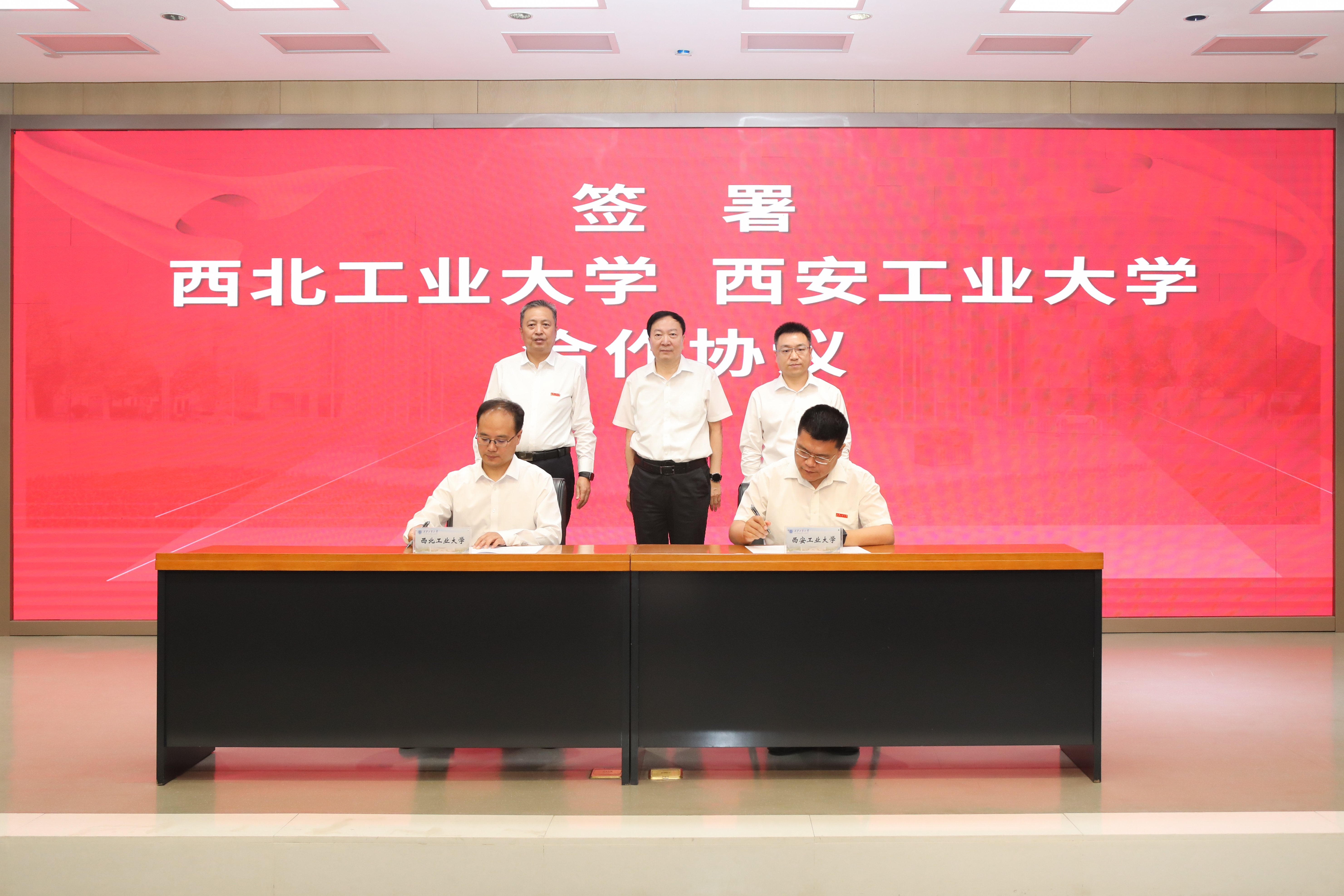 BEAT365副校长王伶与西安工业大学校长姚尧签署合作协议。李言荣,何玉麒,侯成义共同见签。