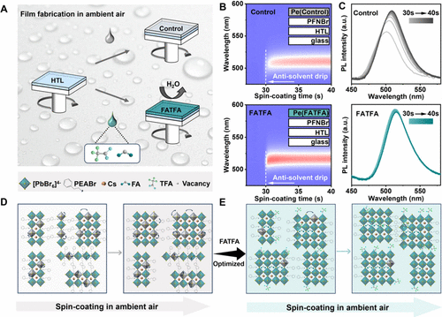 钙钛矿发光二极管(PeLED)因其性能优异、可溶液加工、发光色纯度高且光谱可调等优点而得到广泛关注。通过研究者的不懈努力,目前已在蓝光、绿光、红光及近红外光谱区间成功实现高效PeLED,彰显出PeLED在全彩显示与固态照明中的应用潜力。然而,钙钛矿材料对水分的高度敏感性导致其加工环境受到严格限制:目前绝大多数PeLED器件仍需在惰性气氛(如氮气手套箱)中制备,以避免材料受环境湿度影响而发生降解。尽管该策略可有效保障器件性能,但严苛的制备条件显然不利于生产成本的降低。因此,开发低成本PeLED制备工艺对推进其应用具有重要意义。