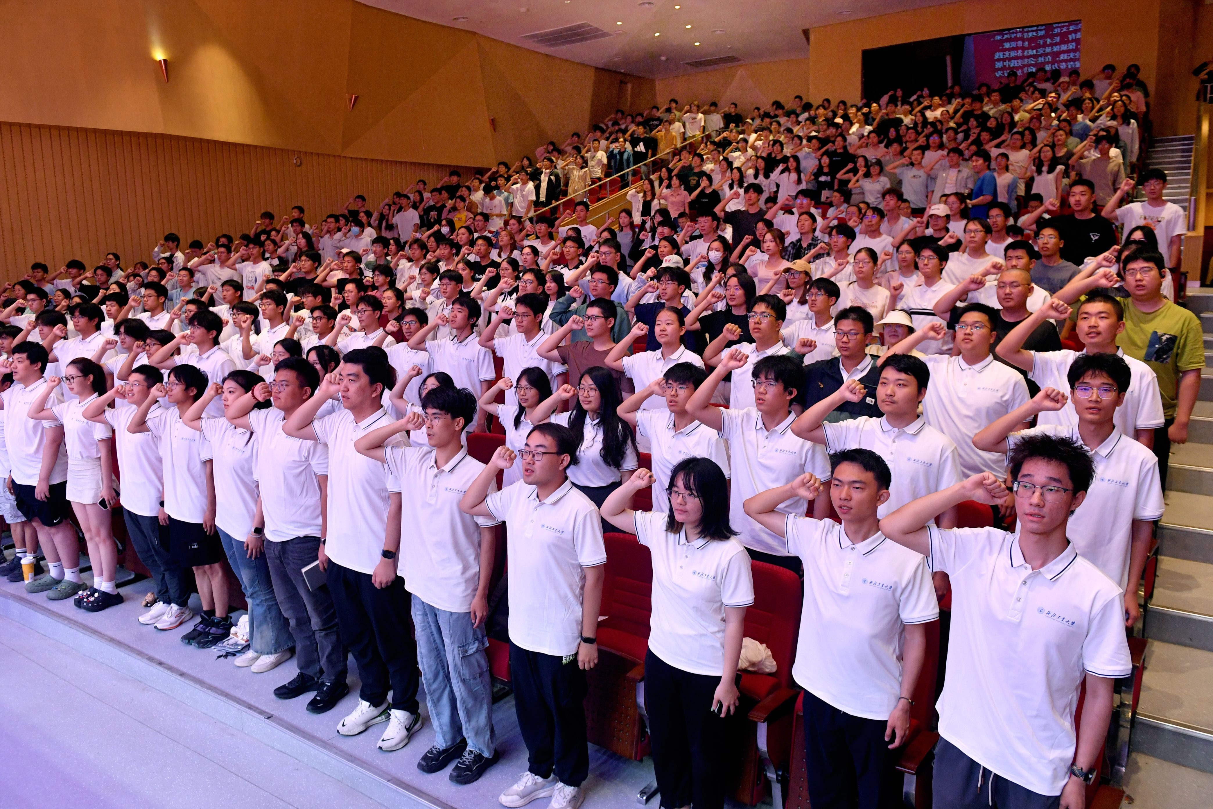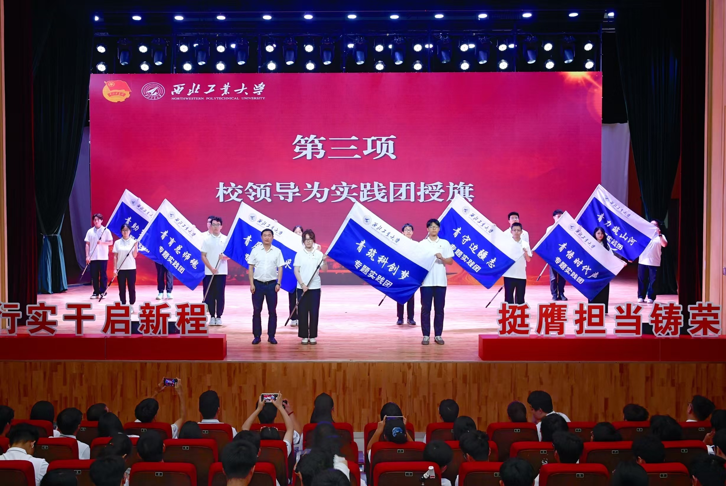 随后,詹浩为社会实践队授旗。2025年暑期,团委认真落实习近平总书记给谢依特小学戍边支教西部计划志愿者服务队队员回信精神,设置“青悟时代声”“青筑科创梦”“青育总师魂”“青助乡村兴”“青守边疆志”“青力筑山河”“青展新风采”等“青”字号实践专题,引导和组织广大青年学生上好理论与现实相结合的“大思政课”。随后,全体实践队员在李熠欣的领誓下庄严宣誓,承诺在社会实践中遵守纪律、团结协作、安全实践,积极展现青春作为、彰显青春风采、贡献青春力量。
