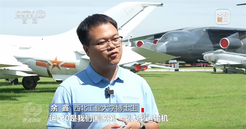 材料工程专业博士生余鑫作为中心讲解员,已经接待过数万名参观者。在他眼中,每一件展品都承载着特殊的意义,其中最为亮眼的是“飞天神器”运-20。