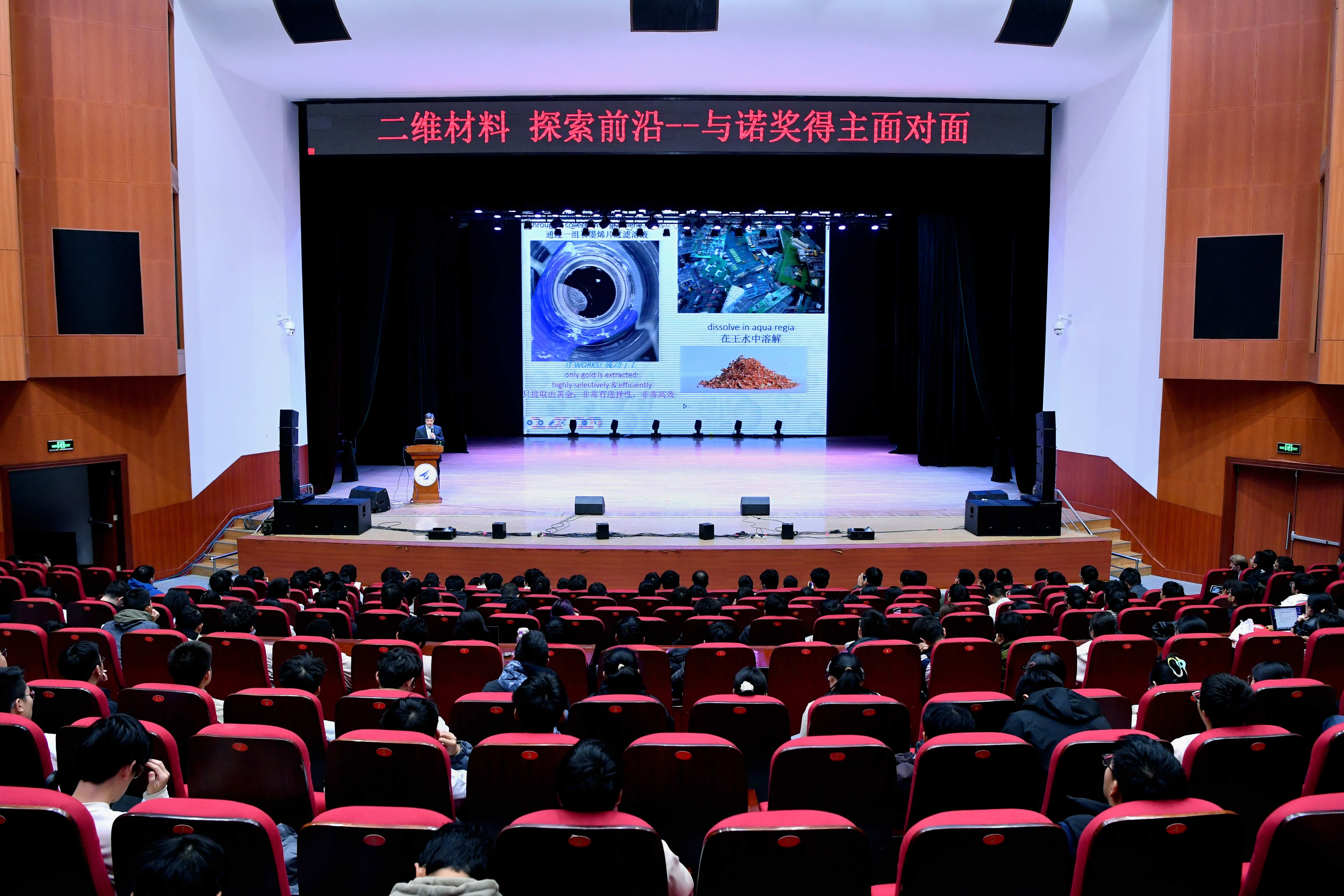 在翱翔学生中心,安德烈·海姆教授为一千余名师生带来了题为《神奇材料-石墨烯等》的专题报告会,现场气氛热烈。安德烈·海姆教授以深入浅出的方式,生动阐释了二维材料独特的物理性质、广阔的应用前景以及当前领域面临的机遇与挑战。