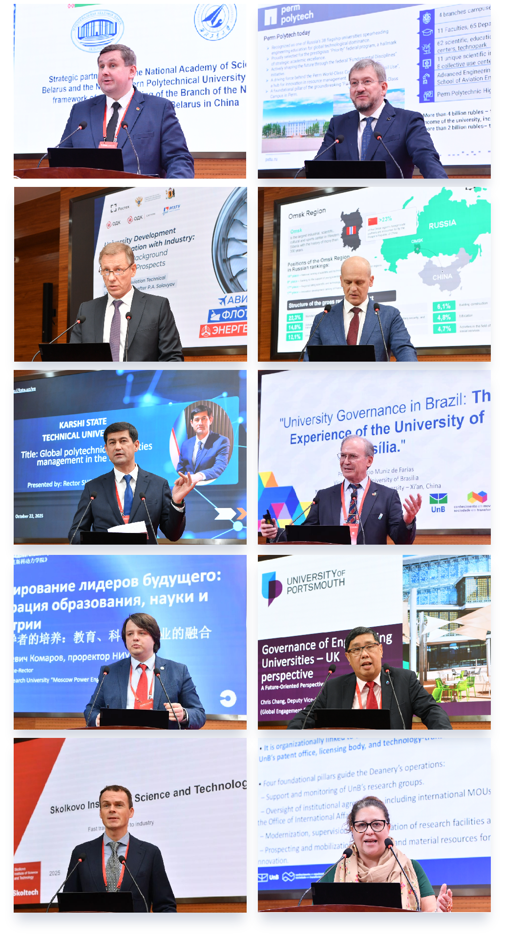 大会报告环节,以“全球工科大学治理,全球创新合作与成果转化”为主题,白俄罗斯国家科学院院士秘书长、彼尔姆国家研究型理工大学校长、雷宾斯克国立航空技术大学校长、鄂木斯克国立技术大学校长、卡尔希国立技术大学校长、巴西利亚大学第一副校长,朴次茅斯大学副校长、莫斯科动力能源学院副校长等国外高校校领导和专家,面向省内参会代表作了10场精彩的大会专题报告。