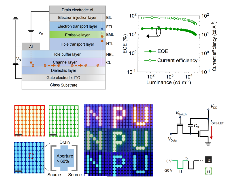 基于上述策略,团队成功制备出红、绿、蓝三色高性能OLET器件。其峰值外量子效率分别达到18.4%、21.2%和14.4%,电流效率分别为26.9 cd A-1、78.0 cd A-1和31.7 cd A-1,最大亮度分别为16110 cd m-2、19577 cd m-2和4383 cd m-2。此外,开发的图案化OFE-LET阵列具备超过60%的开口率,像素电路寄生功耗仅为5.6%。该研究不仅创新性地为开发高效率、高亮度和低功率损耗的有机发光晶体管确立了关键的器件设计原则,并为推动大面积柔性显示、电泵浦有机半导体激光器和光通信等前沿领域应用提供了全新路径。