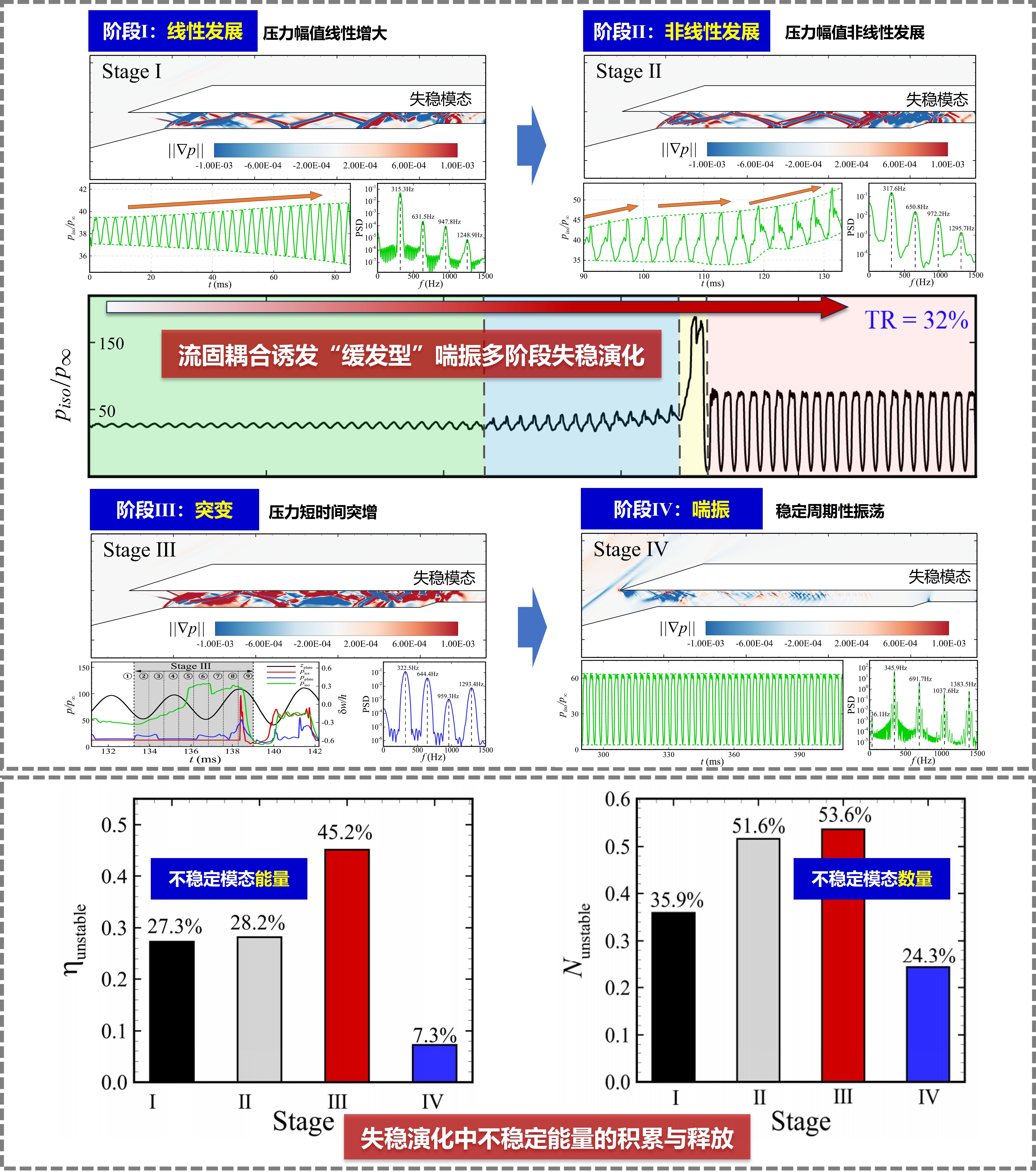 叶坤团队的研究揭示:与以往由外部扰动诱发的传统“突发型”喘振不同,壁板的流固耦合效应使系统经历了一个独特的“缓发”过程,其喘振形成时间是传统刚性进气道的数倍以上。并且在这一过程中,喘振演化过程呈现出由线性增长、非线性增长、突变直至完全喘振的多阶段演化特征。壁板流固耦合导致进气道非定常流场不稳定能量的持续积累与释放,最终触发流动的全域失稳并形成周期性喘振。不同于传统研究中由外界扰动诱发的喘振机制,该研究中诱发喘振失稳的是一种由内部流动与结构相互作用形成的自激扰动源,尽管其初始扰动极为微弱,但表现出高度持续的积累效应和独特的多阶段特性。