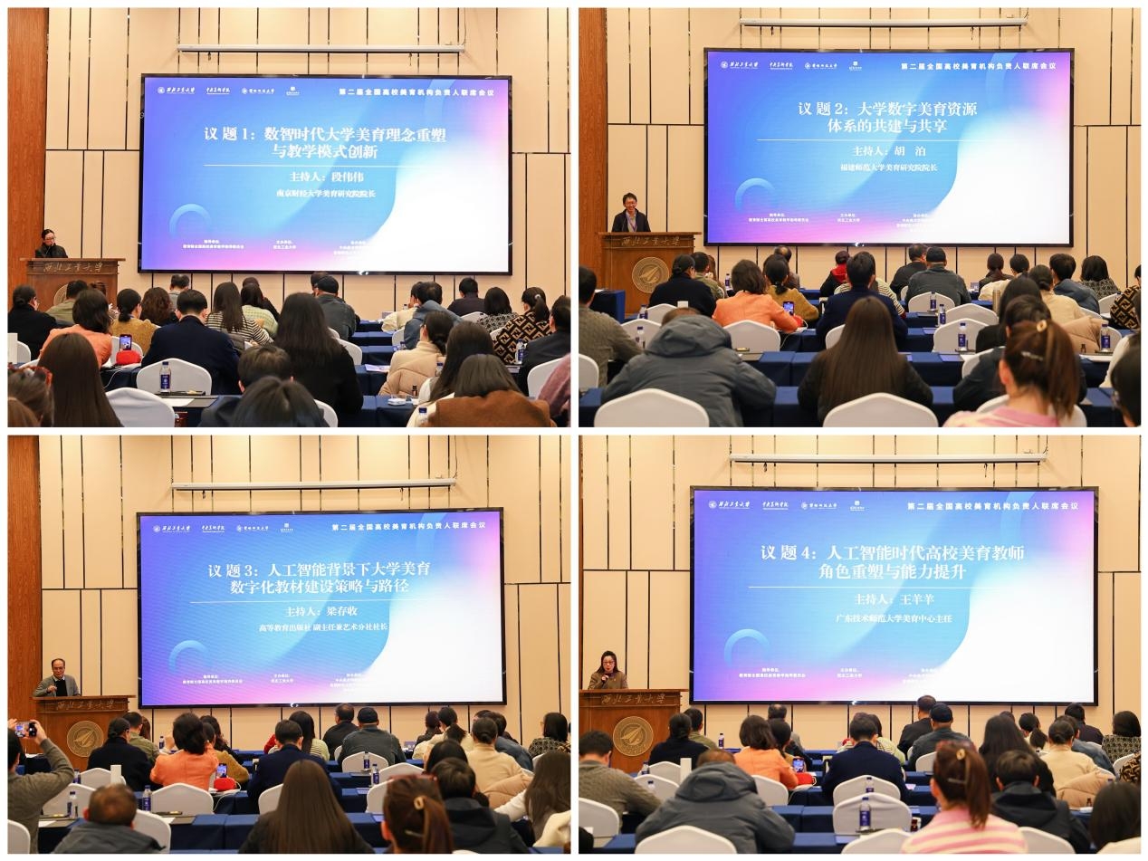 下午,四大分会场围绕数智时代大学美育理念重塑与教学模式创新、大学数字美育资源体系的共建与共享、人工智能背景下大学美育数字化教材建设策略与路径、人工智能时代高校美育教师角色重塑与能力提升四大议题,同步开展互动研讨工作。