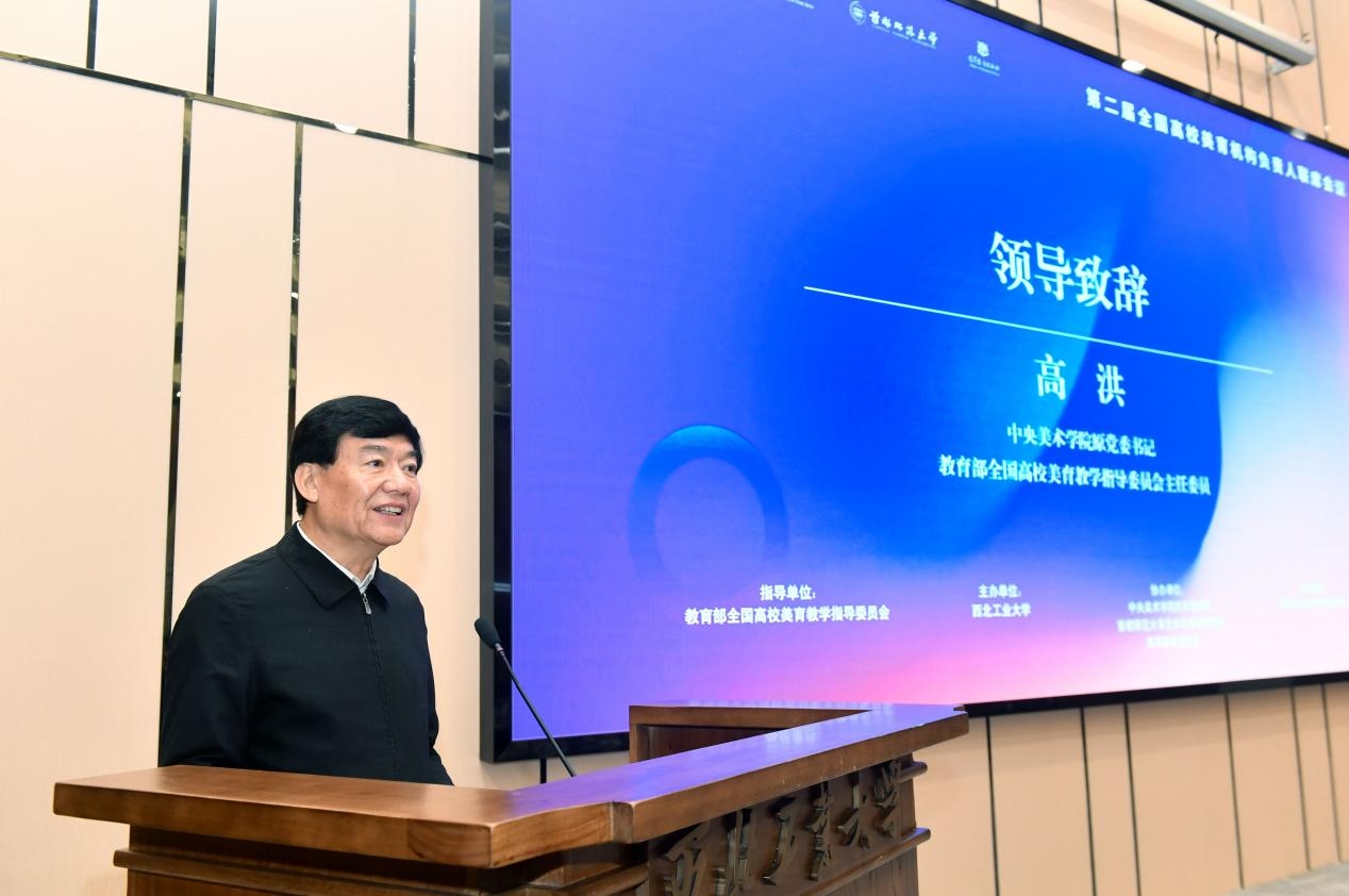 高洪在致辞中强调弘扬中华美育精神的时代意义,指出美育是铸魂育人的关键路径,关乎青年一代身心健康成长,强调高校美育应扎根时代生活,遵循美育特点,坚守文化根脉,并提出数智时代需推动美育理念与实践创新,促进人文与科技融合,呼吁全国高校美育机构扛起使命担当,共同构建高质量美育体系。
