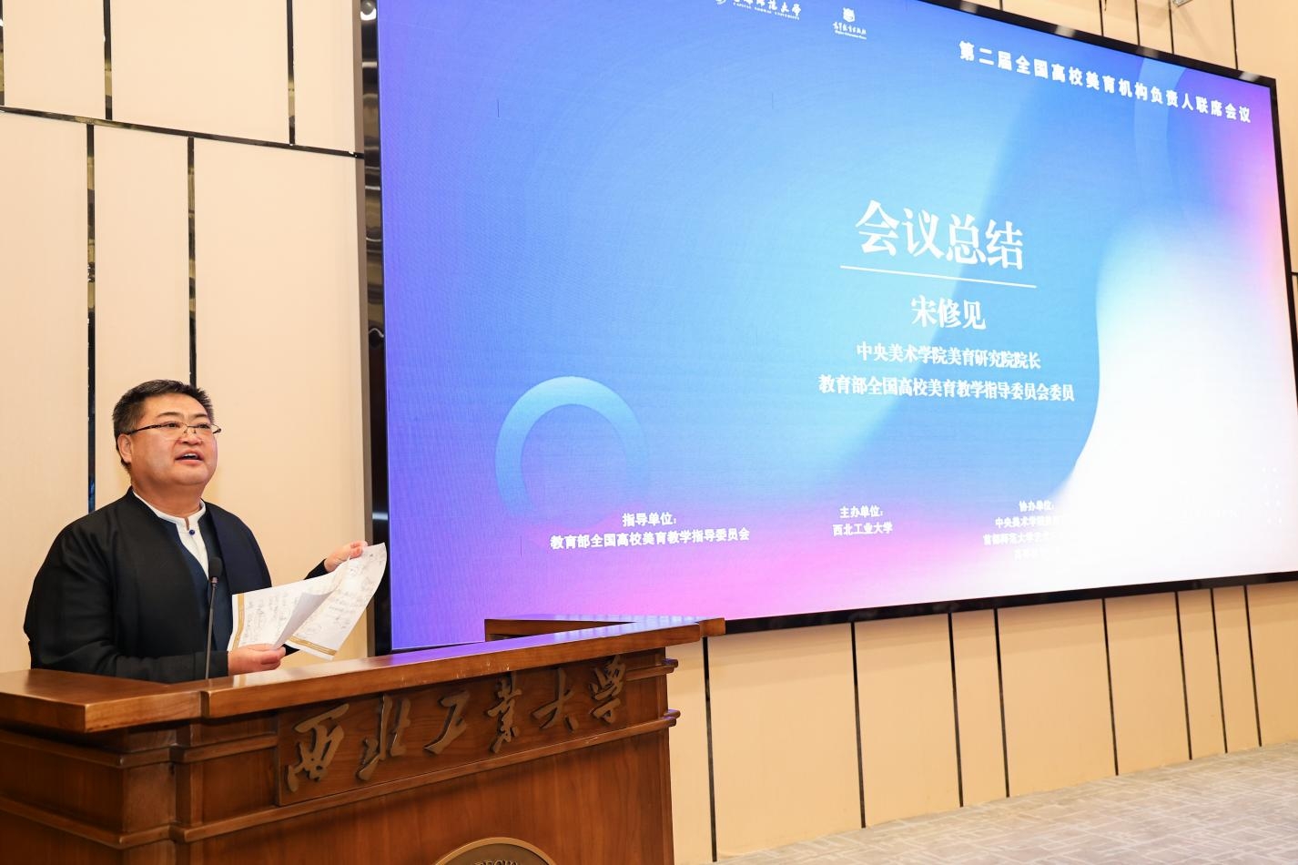 经过分会场总结,宋修见为本次联席会作总结发言,强调美育教师需自内而外提升素养,提倡美育课程要多学科融合,促进艺术、人文、科技在美育课程建设过程中的融合与创新,并呼吁推动高校美育机构设置,持续发挥美育机构在高校人才培养方面以美育人、以文化人的重要作用。