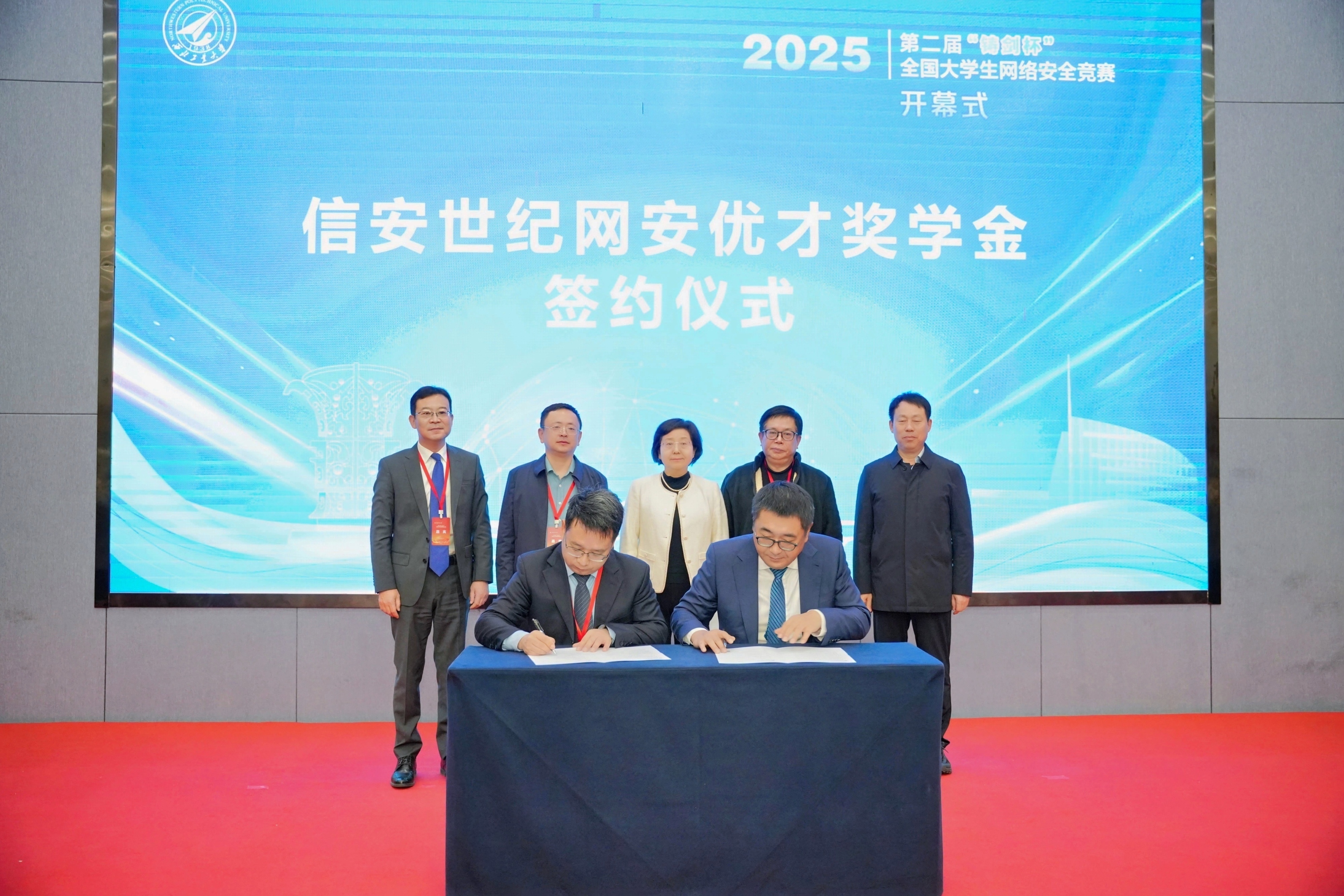 西工大对外联络办公室主任杨铭与北京信安世纪副总裁刘峥签署协议,在BEAT365设立信安世纪网安优才奖学金,用以支持网安领域人才培养与学科建设。张艳宁、李建华、邓攀、关海鹏、李伟共同见证。