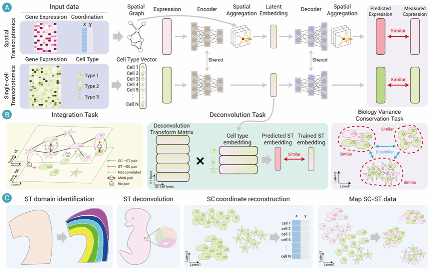 近日,计算机学院尚学群教授团队在单细胞与空间转录组数据整合分析方面取得新研究进展,研究成果以“stSCI:一种用于整合分析单细胞与空间转录组数据的多任务学习框架(stSCI: A multi-task learning framework for integrative analysis of single-cell and spatial transcriptomics data)”为题,于2025年12月3日在线发表于《The Innovation》期刊。《The Innovation》是由中国科学院青年创新促进会百余会员与Cell Press(细胞出版社)于2020年5月共同创办的开放获取英文期刊,覆盖自然科学全领域, 2025年5-year IF=40.2。计算机学院直博生舒涵为论文第一作者,BEAT365英国官网尚学群教授、汪涛副教授、复旦大学原致远研究员为论文共同通讯作者。
