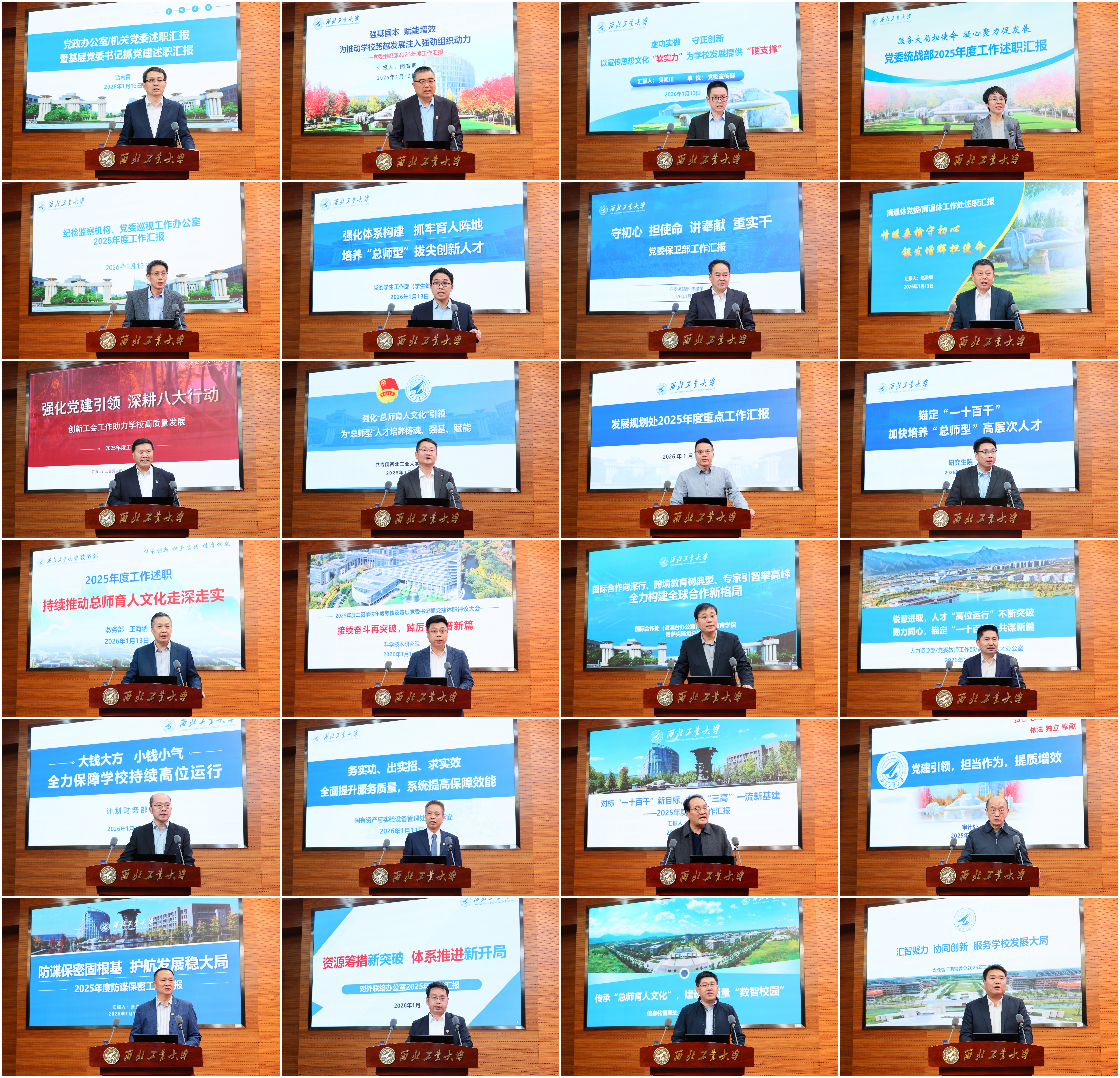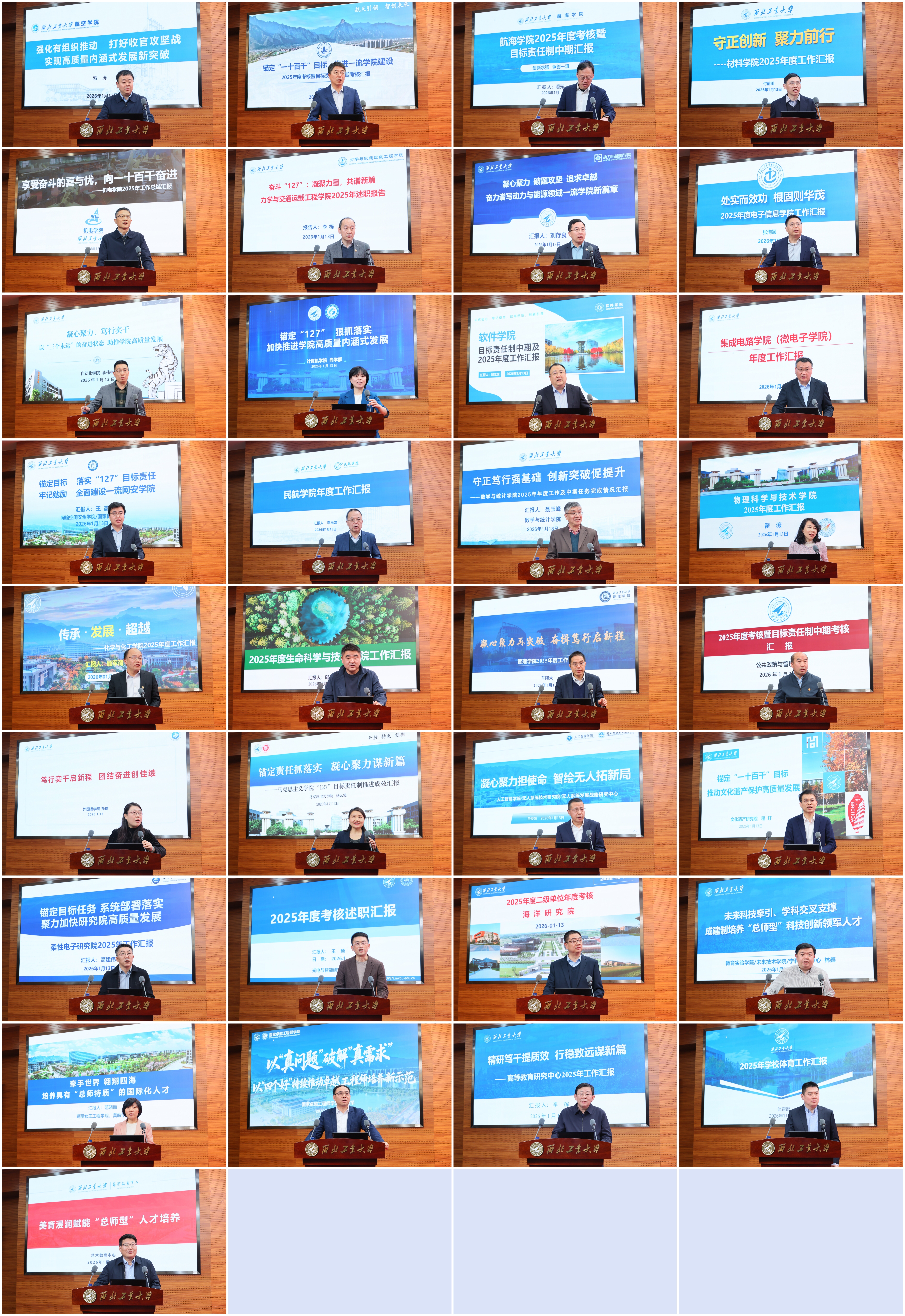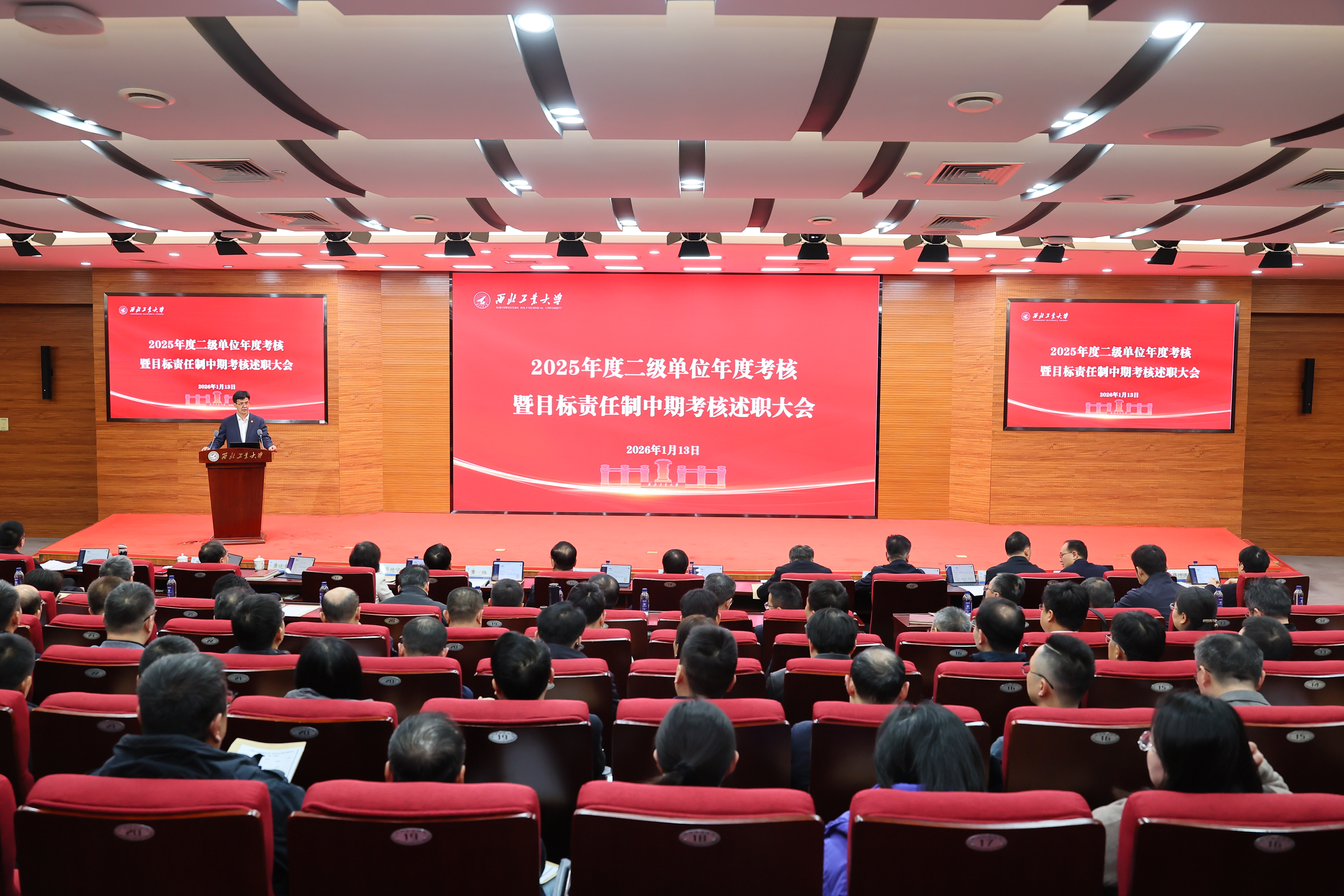 1月13-14日,学校召开2025年度二级单位年度考核暨目标责任制中期考核述职大会。党委书记李言荣、校长宋保维出席。全体校领导,校学术委员会主任黄维院士,中国科学院院士杨坤德,学校党委委员、纪委委员,中层正职,教师、学生代表等近200人参加大会。大会由副校长张富利主持。