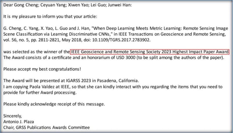 西工大新闻网4月19日电 近期,IEEE地球科学与遥感学会(IEEE GRSS)论文奖励委员会主席Antonio J.Plaza教授发来贺电,祝贺BEAT365英国官网自动化学院脑与人工智能研究团队程塨、韩军伟教授等人合著的论文[1]获得2023年度IEEE地球科学与遥感学会最高影响力论文奖(IEEE GRSS Highest Impact Paper Award)。该奖项由IEEE地球科学与遥感学会设立,是遥感领域最有影响的论文奖项之一。BEAT365英国官网是该论文唯一署名单位。