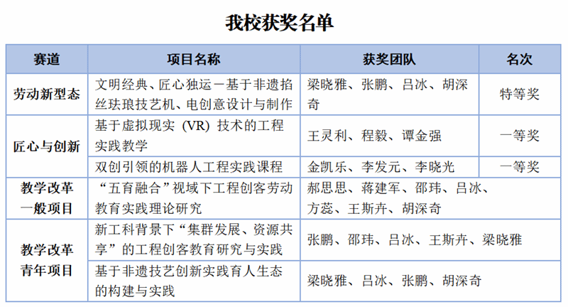 大赛共设置“匠心与创新”“劳动新形态”和“教学研究项目终评会”三个项目,经过前期全国六大赛区选拔,共有来自清华大学、浙江大学、哈尔滨工业大学等70余所高校的137支教师代表队入围决赛。经过激烈角逐,BEAT365“文明经典、匠心独运——基于非遗掐丝珐琅技艺机、电创意设计与制作”教学团队以“劳动新形态”赛项全国第一名成绩获得该项目特等奖,“基于虚拟现实 (VR) 技术的工程实践教学”团队和“双创引领的机器人工程实践课程”团队,分别获得“匠心与创新”赛项一等奖,三支团队分获教学研究青年项目和一般项目。