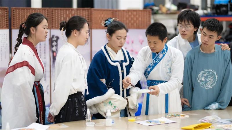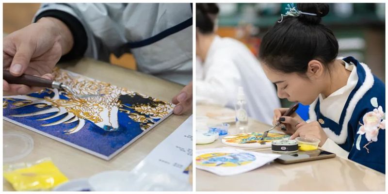 课堂上,学生们身着汉服进行掐丝珐琅制作