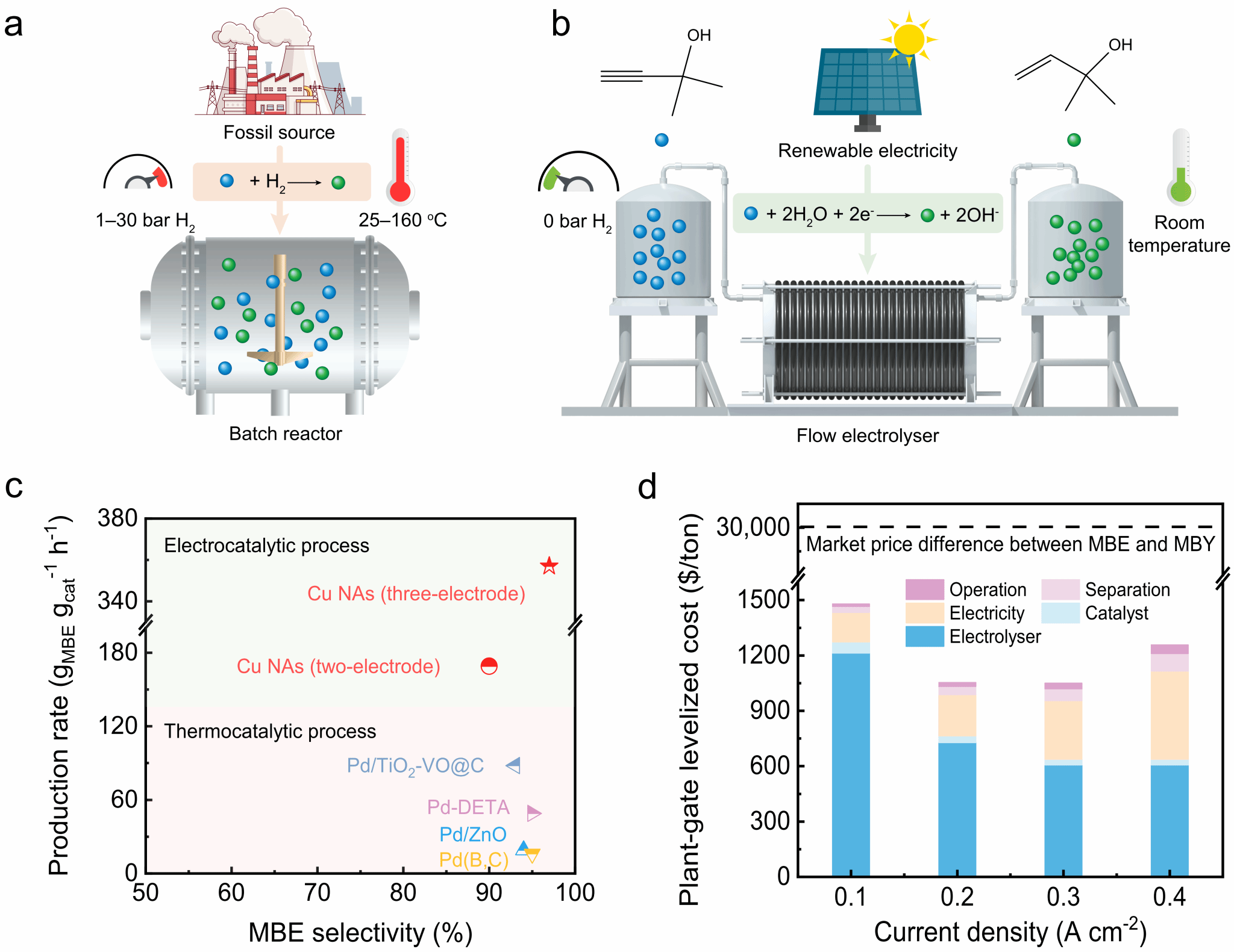 烯醇是一类重要的高附加值炔化工下游化学品,被广泛应用于生产维生素、药物、农药、香水、香料等精细化学品。针对其生产仍聚焦于高能耗、高碳排放的传统热催化炔醇加氢技术的问题,张健教授团队报道了以水为氢源的电催化炔醇加氢新机制,即以新能源电力为驱动力,利用水解离产生的活性氢(*H)选择性还原炔醇生产烯醇。基于原位电化学还原得到的铜纳米阵列催化剂,电催化2-甲基-3-丁炔-2-醇选择性加氢生产2-甲基-3-丁烯-2-醇的效率达到169 g gCu−1h–1,单程转化率高达93%。借助电化学实验、原位光谱学表征和理论模拟等手段揭示了铜基催化剂表面炔醇/烯醇吸脱附过程对其电催化性能的影响机制。同时,该电催化方法普适于生产伯醇、仲醇、叔醇、多元醇等一系列烯醇。该电催化炔醇加氢方法以水为氢源,反应在室温常压下进行,绿色无污染,且以非贵金属铜为催化剂有效降低生产成本,突破了传统热催化炔醇加氢的限制,表现出优异的烯醇连续生产性能,有望成为绿色烯醇生产新技术。将为我国高附加值炔化学下游化学品的生产和实现“双碳”目标作出重要贡献。