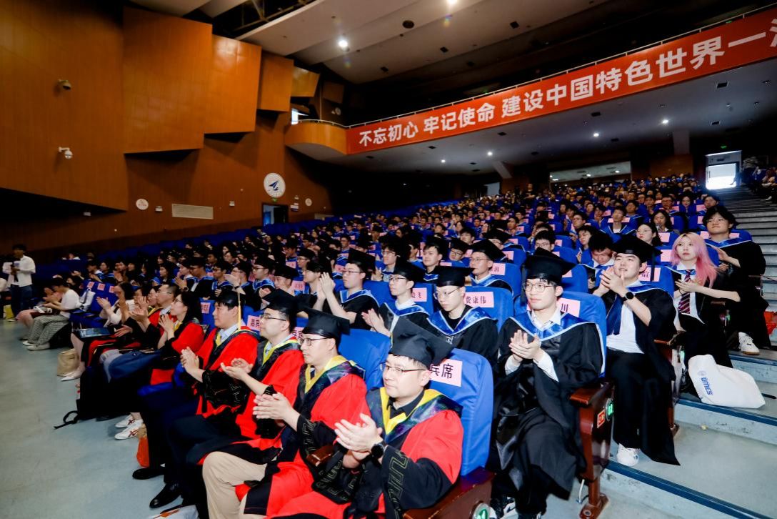 江宇轩同学作为毕业生代表发言。首先,他代表全体毕业生向母校、师长、家人和朋友致以感谢,回顾了四年来在学院的学习及生活经历。他表示,学院国际化的教育教学模式和师长、朋辈间的鼓励与关怀,让同学们从最初懵懂茫然的新生成长为如今独立自信、勇于担当的时代青年。通过参与社会实践、创新创业等活动,同学们不断突破自我,跳出舒适圈,不仅在学业上取得了优异的成绩,更是成长为具有综合实力的国际化人才。