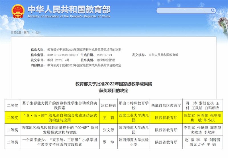 西工大新闻网7月27日电(张珊珊 陈知君)7月24日,教育部公布了2022年国家教学成果奖获奖名单。西工大幼儿园成果《“真·活·趣”幼儿亲自然综合实践活动范式的构建与应用》获得了基础教育国家级教学成果二等奖,这也是幼儿园继2018年获奖后第二次荣获国家级基础教育国家级教学成果奖。