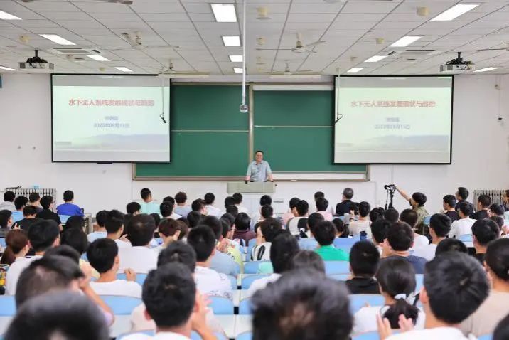 课堂中,宋保维校长从水下无人系统的定义与作用、水下无人系统的发展现状、水下无人系统的典型应用、自主水下航行器技术发展四个方面展开,全面详实地介绍了水下无人系统状况,为新生学子们带来一场精彩的学术盛宴。