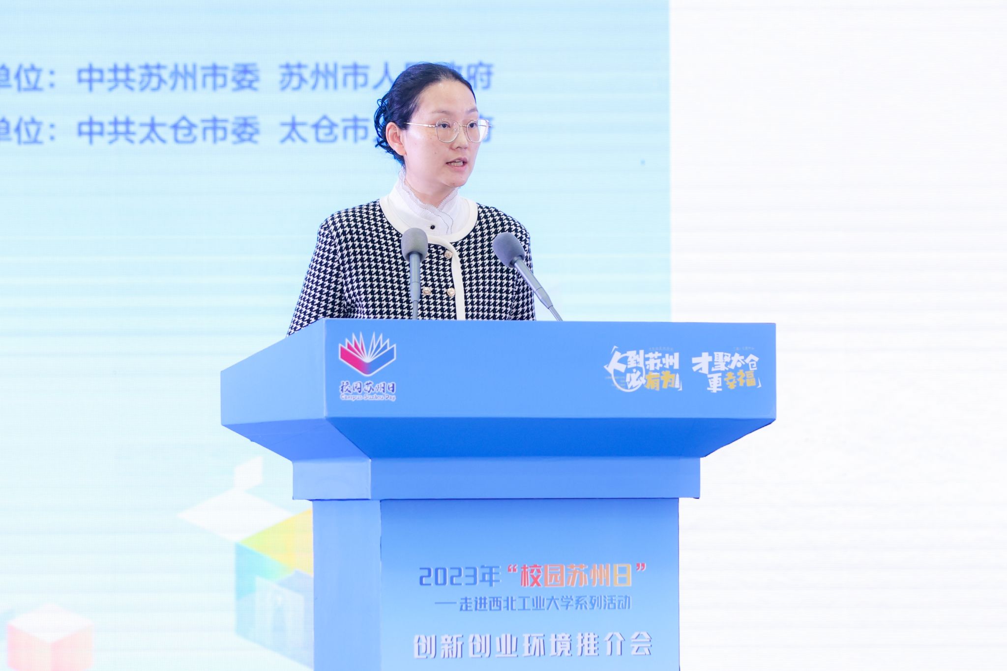 郭静作苏州创新创业环境推介。她表示,苏州的魅力,源自她是“融古贯今”的宜居福地,源自她是“机遇无限”的创新高地,源自她是“成人之美”的创业热土。苏州这片创新创业的沃土,正是可以让各位人才实现自我价值不断攀升的云梯。选择苏州,就是选择机遇;选择苏州,就是选择更美好的未来。诚挚邀请同学们把苏州作为梦想的起点、事业的舞台,与苏州共同成长、相互成就。