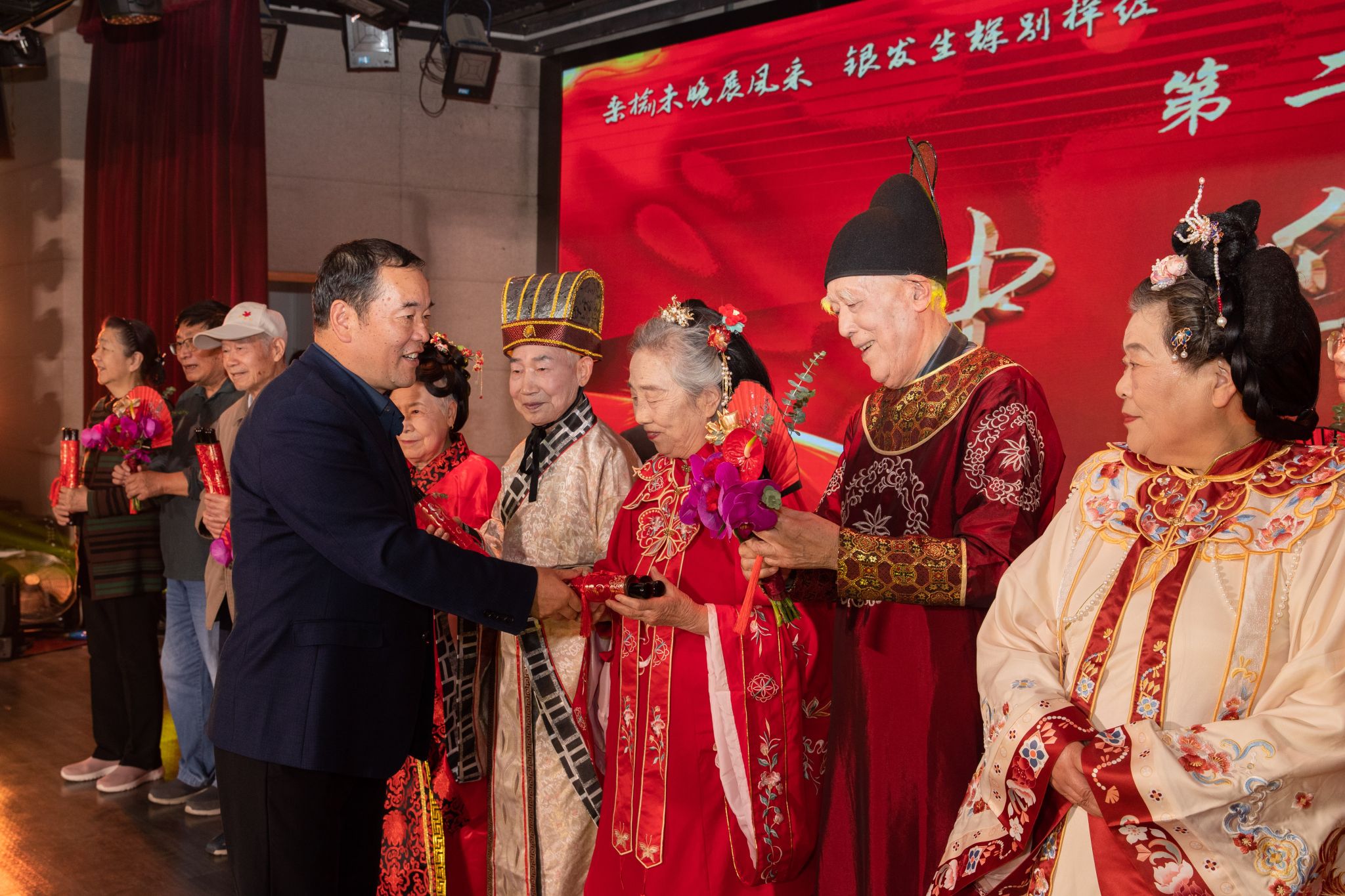 “中华囍”篇章,播放了九对金婚代表的感言及其子女、孙辈对老人们的祝福视频,朴实温暖的相识相知相守故事,铸国重器、育国栋梁的默默奉献,对另一半发自肺腑的感谢,令现场观众无不动容。随后,他们身着中华传统服饰,再行中华古礼,穿越荏苒时光,重温爱的承诺。陈建有代表学校为金婚夫妇代表颁赠了饱含祝福的婚誓和鲜花。