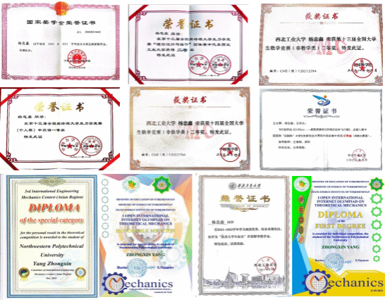 在筑牢专业基础知识的同时,他也非常注重理论与实践相结合。大学三年,杨忠鑫的综合测评均位于年级第一名,这与他在竞赛科研方面的优异表现密不可分。早在大一下学期,他就获得了第十三届全国周培源力学竞赛个人赛一等奖。出于对学科的热爱,他积极参加各类力学竞赛,并在第三届国际大学生工程力学竞赛(亚洲赛)中获国际特等奖,在第一、二届国际奥林匹克互联网学科竞赛中分别获国际冠军、国际一等奖的好成绩。