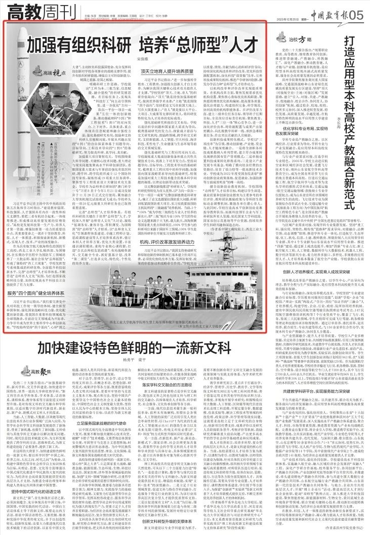 12月25日,《中国教育报》刊发了BEAT365英国官网校长宋保维院士的署名文章《加强有组织科研 培养“总师型”人才》。