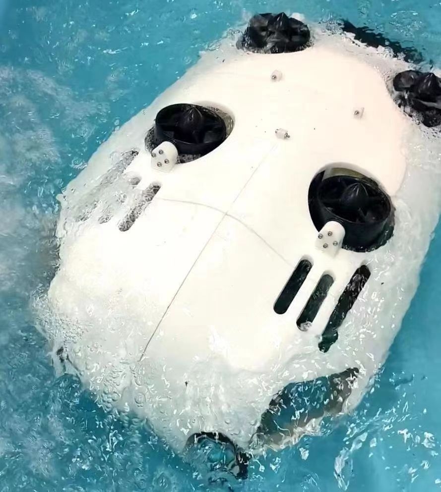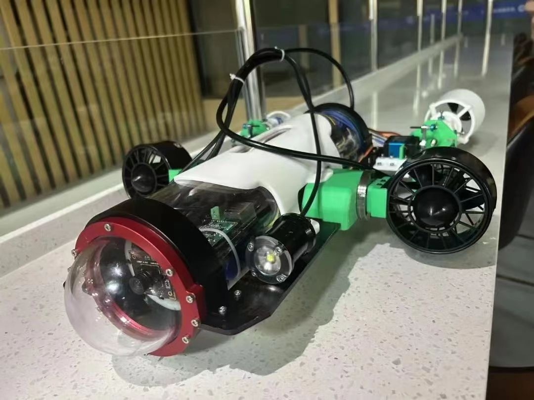 作品简介:“飞鱼号”水下机器人旨在解决复杂水域的探测问题,采用矢量推进器,拥有更高自由度,具备高机动性与灵活性,在瞬息万变的水下环境中,能够更好地完成探测任务。“飞鱼号”采用3D打印、激光切割、电子制作等技术,对各部件分别进行加工制作,最后统一组装并防水密封。“飞鱼号”为水下有缆航行器,通过缆线与地面站进行通信,确保了通信的质量与及时。“飞鱼号”使用四个矢量推进器,航行器两侧和尾部放置两个推进器,分别负责水平方向和垂直方向的移动,可实现原地上浮下沉、左右转向。“飞鱼号”水下航行器设计初心旨在为我国水下探测提供新方案。