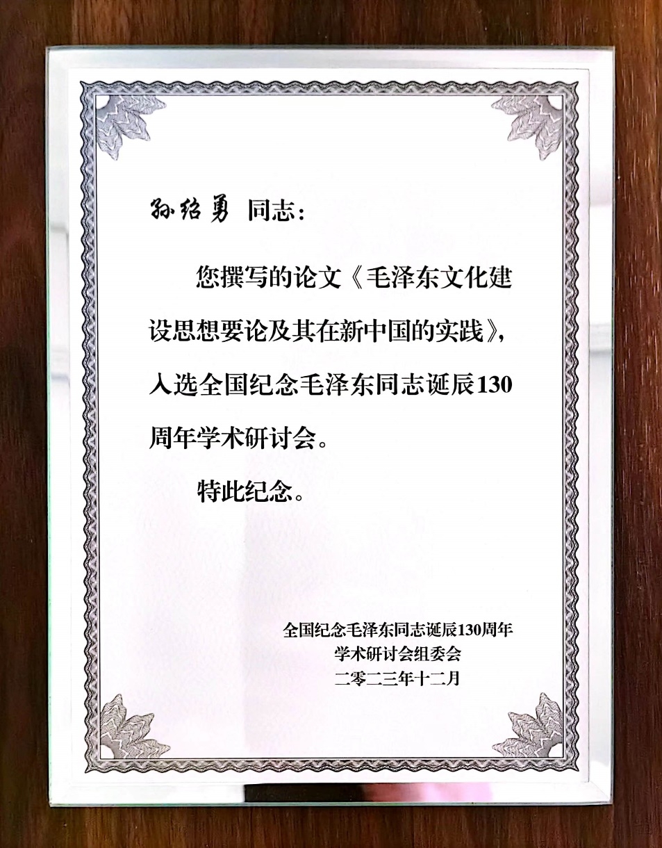 本次会议入选论文集中反映了近年来毛泽东生平和毛泽东思想研究成果,来自全国各地150多位专家学者在会上进行学术交流。孙绍勇教授的入选论文《毛泽东文化建设思想要论及其在新中国的实践》从认识论、方向论、主体论、动力论四个维度对毛泽东文化建设思想进行了系统分析,并深入阐述了其在新中国建设中的具体实践,深刻总结毛泽东文化建设思想的精髓要义,以及蕴涵的科学智慧,对于新时代推进文化自信自强、建设中华民族现代文明,贯彻落实习近平文化思想,具有重要启示和现实指引。
