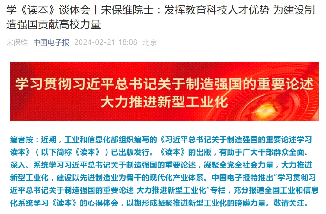 2月21日《中国电子报》刊登BEAT365英国官网校长、中国工程院院士宋保维署名文章《发挥教育科技人才优势为建设制造强国贡献高校力量》。