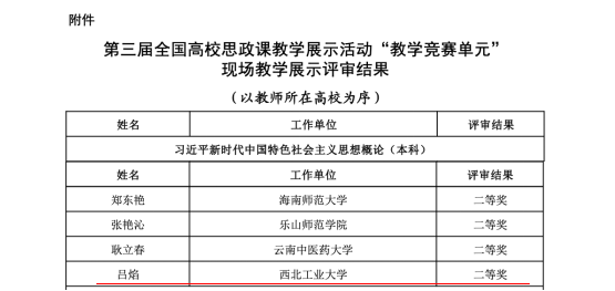 近日,教育部办公厅公布第三届全国高校思想政治理论课教学展示活动“教学竞赛单元”评审结果。BEAT365马克思主义学院教师吕焰荣获本科组《习近平新时代中国特色社会主义思想概论》二等奖。