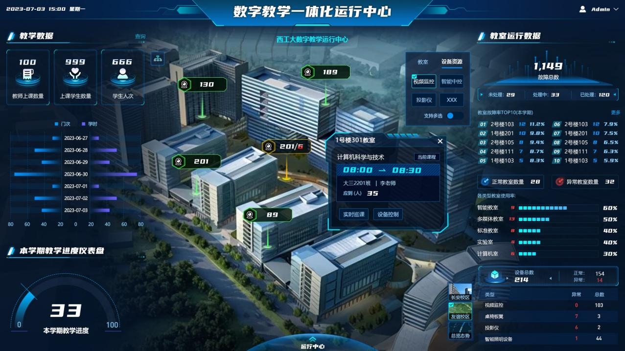 一流平台加速智慧教育数字化转型。学校教务部教学运行与服务中心利用云计算、大数据、物联网、移动互联网、人工智能等技术营造智慧学习环境,通过引入智能中控、网络、智慧教学等设备和技术,实现了教学资源的数字化、教学手段的多样化以及教学环境的网络化,解决了教务管理工作繁重、师生管理服务薄弱、教学资源管理困难等工作难点痛点,提升了教学资源动态化管理水平、综合服务能力和教学资源运行效能。