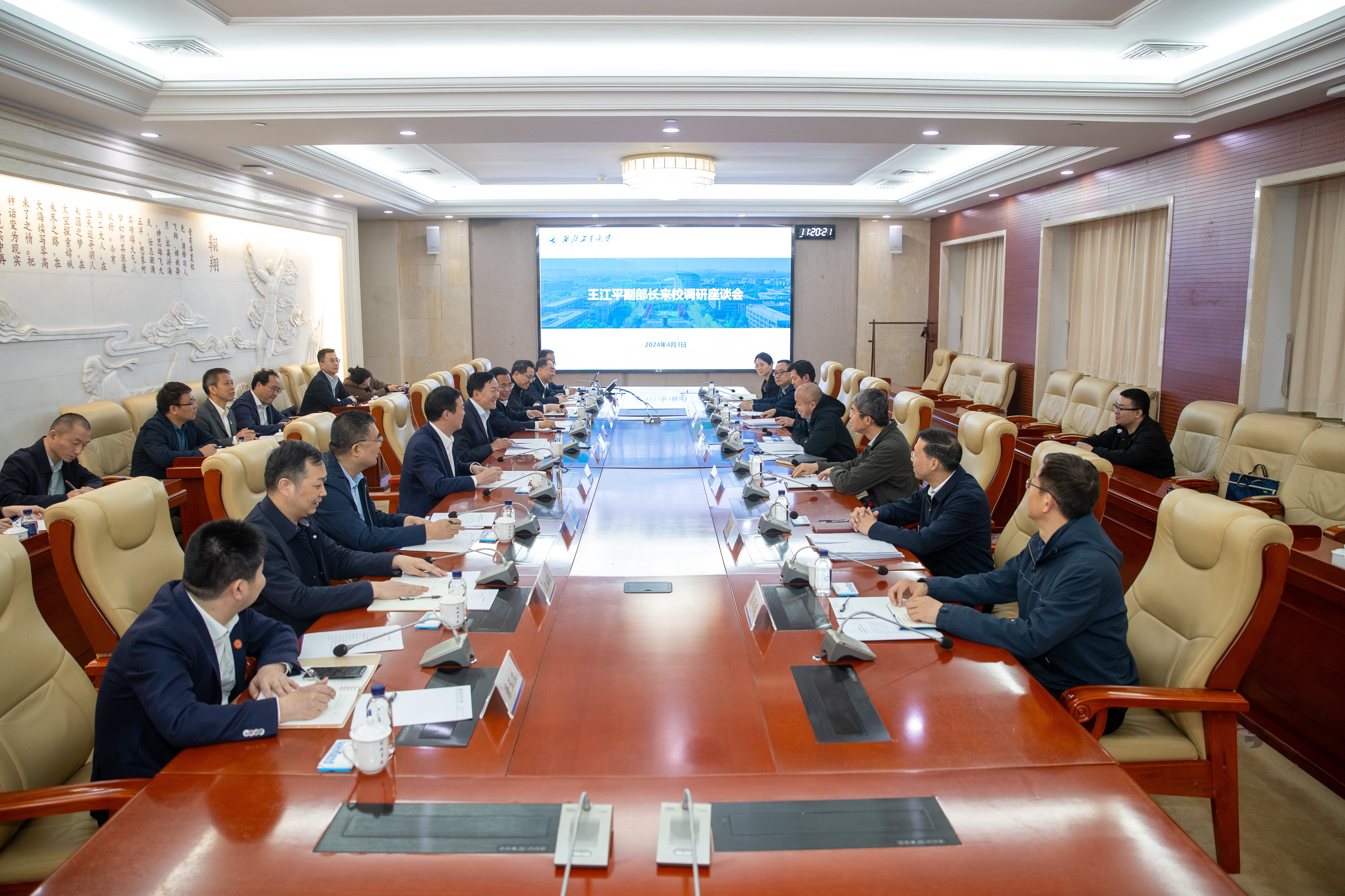 李言荣代表学校和在外出差的宋保维校长对王江平一行来西工大调研表示热烈欢迎,并向工信部长期以来对西工大发展建设给予的关心和支持表示衷心感谢。他说,当下,学校正锚定“127”近期发展目标和落实举措,聚焦办学核心关键,“强特色、筑高峰”,加快推进“双一流”建设。西工大党委将认真贯彻落实工信部党组的部署和要求,推进教育、科技、人才协调融合发展,以“三项改革”牵引推动产教融合,积极对接工信部重大项目需求,为加快发展新质生产力、推动新型工业化建设贡献更大的力量。