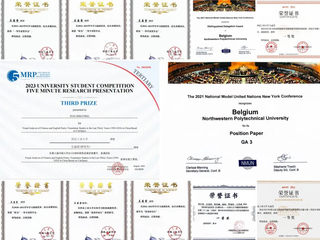 “学”英语与“用”英语,一字之差却间隔着“接受知识-内化知识-应用知识”的漫长过程。左晶莹重视专业学习,学位课加权成绩92.13,近半专业课程达到满绩,超四分之三课程90分以上。在以英语演讲、英语综合能力为代表的多层次学科竞赛中,左晶莹累积获奖20余项。依托深厚学科基础,左晶莹在国际模拟联合国大会、世界青年交流论坛中多次与世界对话。在全美模拟联合国大会上,左晶莹以“外交官”身份与来自美国、英国、法国、澳大利亚的同辈共同讨论世界热点议题,在经过多轮磋商与协作后,左晶莹与队友在会场上贡献中国智慧,获得“Position Paper”奖(国际一等奖)。用青年之力,发青年之声,用实际行动推动国际传播工作,展示真实立体全面的中国。积极践行习近平总书记对中国外语学习者“具有全球视野、通晓国际规则、熟练运用外语”的深切希望,左晶莹将坚持在学透外国语言的基础上,用外语言说拳拳爱国之心。