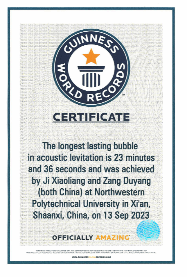 研究团队提出了利用超声场稳定气泡这一新方法,利用声腔共振机制形成了声悬浮气泡,发现其稳定性得到了显著提升。SDS气泡可以在超声环境下存在超过15min。即使没有任何表面活性剂的稳定作用,纯水气泡也可以稳定7min以上,这比常规气泡的寿命提高了两个数量级以上。此外,通过实验证明,在声场的稳定作用下气泡甚至能够在针刺等外部扰动下保持稳定。这种超稳定性是由于驻波声场在悬浮气泡的内外表面都提供了独特的声辐射压力分布,这样的声辐射压分布一方面平衡了液体重力,实现了稳定悬浮。另一方面对气泡膜提供了挤压作用,抵消了静水压力,从而抑制了其中的重力排液。该研究首创了通过超声悬浮稳定气泡的新方法,并进一步揭示了造成这种超稳定性的物理机制,并创立了“地面上最长寿命气泡”的吉尼斯世界纪录。这种无接触、无“污染”、超稳定的声悬浮气泡可以作为理想的生物/化学反应器,用于晶体生长、细胞培养的液体模板/独特的微环境,在材料工程、流体物理和生命科学等领域具有广阔的应用前景。
