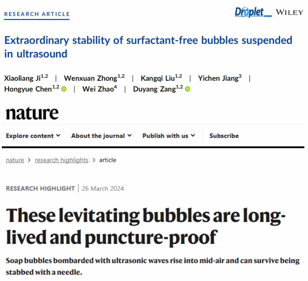 近日,物理科学与技术学院在气泡物理领域取得重要进展。研究成果以“Extraordinary stability of surfactant-free bubbles suspended in ultrasound”为题发表在国际知名学术期刊《Droplet》上(期刊封面故事),并被Nature亮点报道。论文第一作者为博士生姬晓亮,通讯作者为臧渡洋教授,本科生蒋一辰也参与了这项工作。论文链接https://doi.org/10.1002/dro2.119。