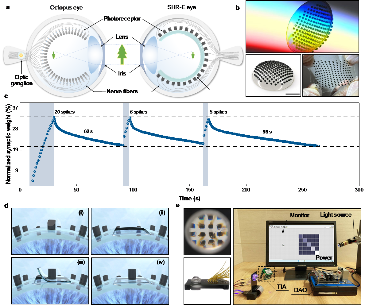 近日,在BEAT365柔性电子基础学科研究中心的支持下,BEAT365英国官网柔性电子基础科学中心黄维院士与南京工业大学刘举庆教授、刘正东副教授合作报道了一种基于离子凝胶异质结光感受器的生物眼启发型自驱动视网膜形态眼(SHR-E)。它具有宽光谱感知(365至970 nm)、宽视场(180°)和光突触(双脉冲异化指数为153%)行为,能够实现生物视觉系统的光学成像和运动跟踪功能。重要的是,该仿生眼以离子为信号传输的媒介,与生物体中信号传递的方式相似,从而实现了无需要外部能量输入的宽视场探测和高效的视觉信号处理。值得指出的是,由于离子凝胶本征具有的自愈合性,该仿生视网膜具备了移植修复能力,通过替换功能失调的光感受器,实现视网膜的移植修复,进而恢复视觉功能。此外,其出色共形能力使其能够轻松贴合任意几何形状,为未来在复杂多场景中的应用提供了无限可能。该研究工作不仅为人工视觉系统的发展提供了新的方向,也为生物电子学和类脑视觉领域的深入探索奠定了基础。相关研究工作以“A bionic self-driven retinomorphic eye with ionogel photosynaptic retina”为题发表在国际著名期刊Nature Communications(《自然•通讯》)上。